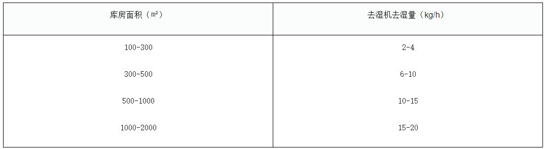 濕度調節:我們在選購去濕機時,要根據室外空氣濕度、庫內要求達到的標準濕度、庫房建筑結構、門窗大小及工作人員情況等因素綜合考慮。去濕機容量的選擇可以參考下表: